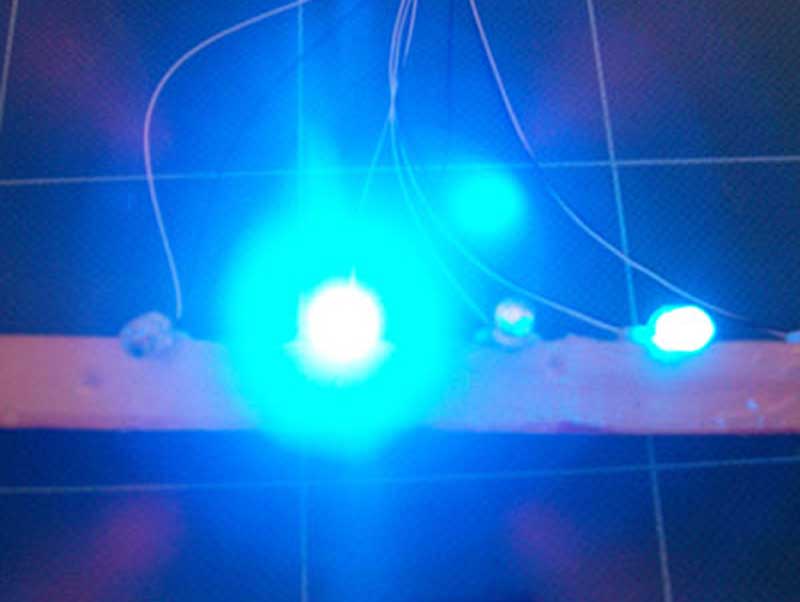 The kit arrives with five (5) 5mm Hi-intensity 24,000 Mcd Blue Strobe Beacons, ramp pulsed at 300mS (roughly 3 times per Second)