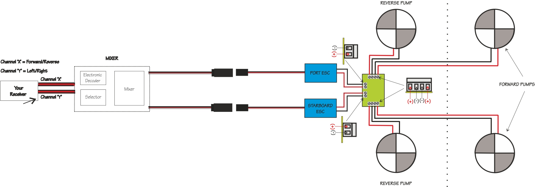 Another innovative module for Pump Type Bait Boats. Allows you to connect and distribute control function from your Left/Right ESC's to whichever pump is needed to drive and Steer your Pump Bait Boat Forward and Reverse.